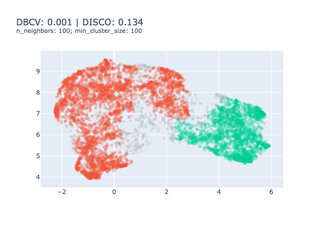 Hence, we need to find metrics that are relevant to the density-based clustering models such as the DBCV Index (Moulavi et al., 2014)6 or the DISCO index (Beer et al., 2025).