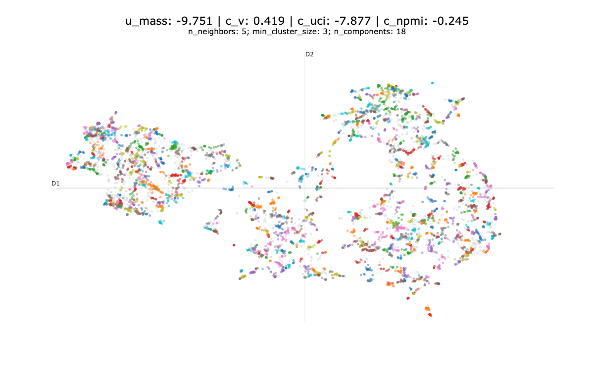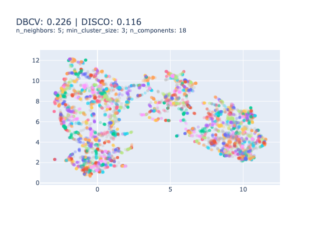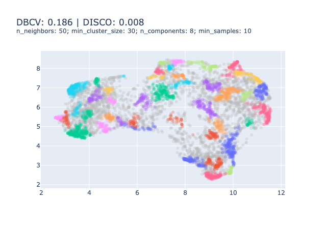 One could choose to focus on evaluating the clustering model to tune the HDBSCAN and UMAP parameters. There exist many metrics for evaluating clustering models that you can find on the scikit-learn website. However, amid the 9 presented, 4 require a ground truth that we don’t have4, 3 are ill-suited to HDBSCAN clustering5 and the two last are good metrics to be optimised.