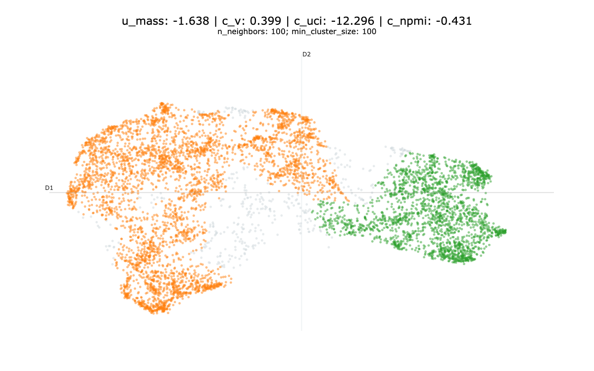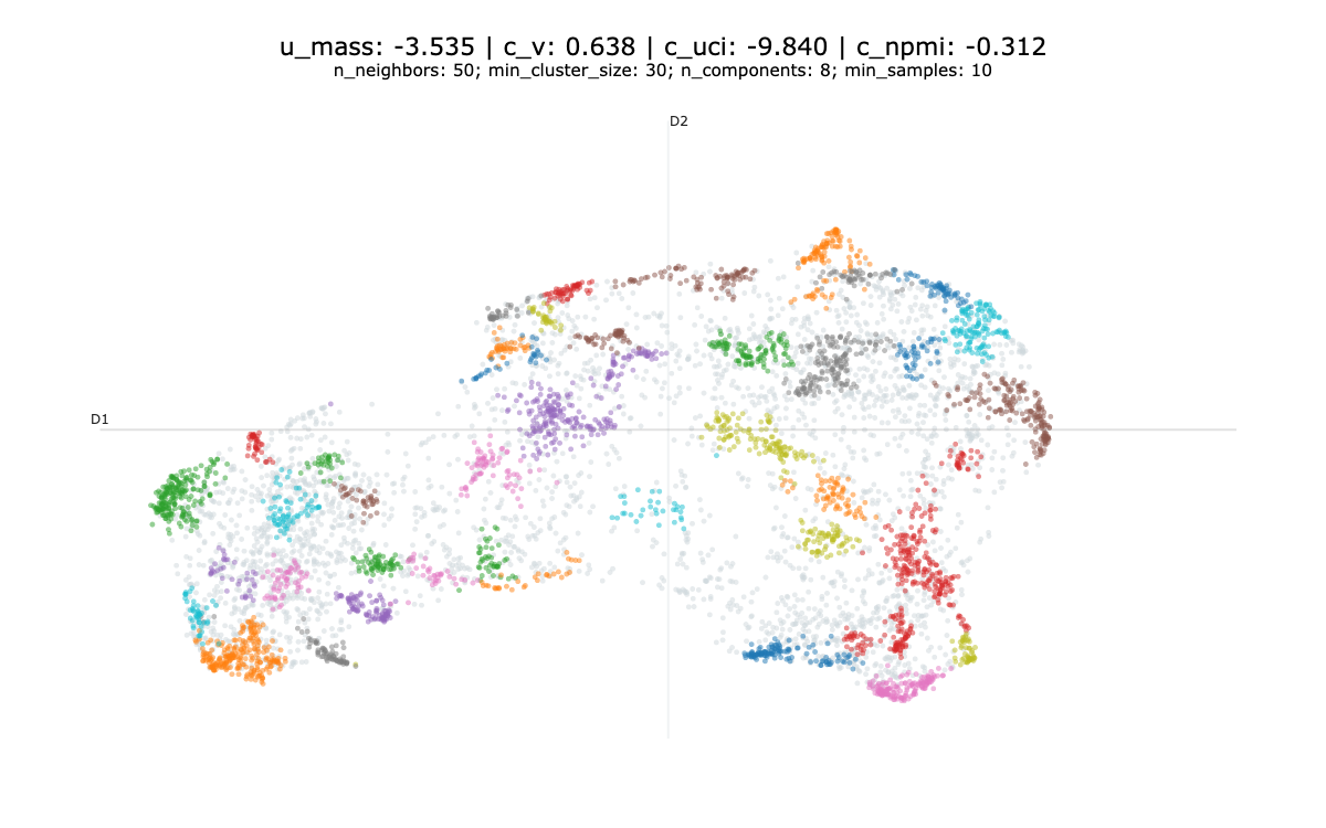 The minimum number of elements in a group to be considered a cluster, otherwise, it’s considered as noise | Generate few large and generic groups. | Generate many small and highly specific groups. | Start with a rather large value and reduce incrementally until obtaining a fine grained topic model2 |