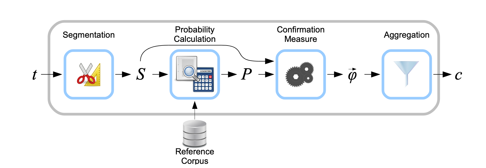 Some other metrics assess whether the representations (ie the top \(n\) words) are good representations of their groups. These metrics fall into the category of Coherence metrics (Röder et al., 2015) and they rely on a reference corpus to estimate how likely words are to be found together. Multiple metrics exist such as \(C_{UCI}\), \(C_{UMass}\) or \(C_V\), and differ from their formulation, but all follow the same structure depicted in Figure 1. This framework includes a “Reference Corpus” to evaluate the probability of two words appearing together.